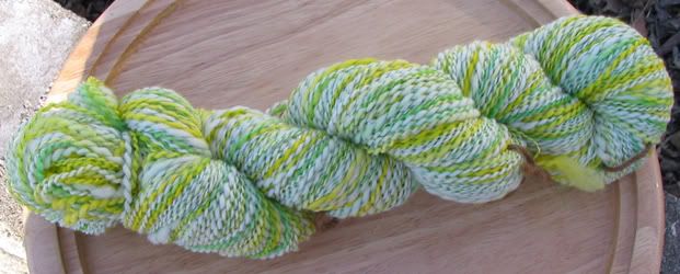 Daffodil Fields is 412 yards of Merino plied with a green polyester thread. Wheel spun.