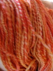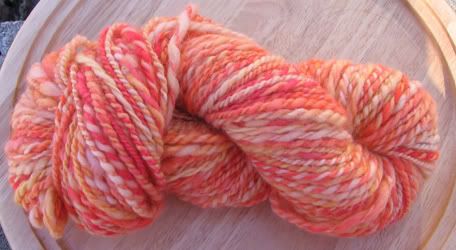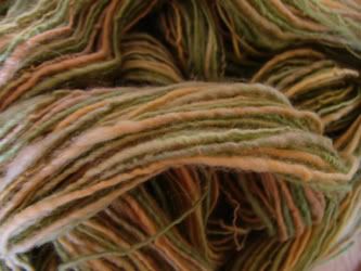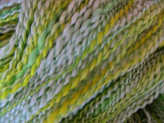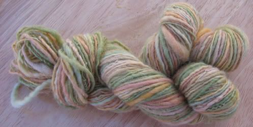 Fruit Stripe is 63 yards of 1-ply Blue Faced Leicester with a stripe of Tussah Silk. It was spun on my Louet S-17 wheel. SOLD!