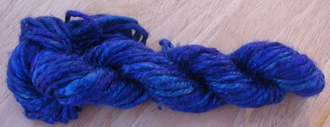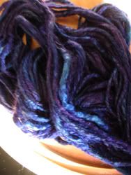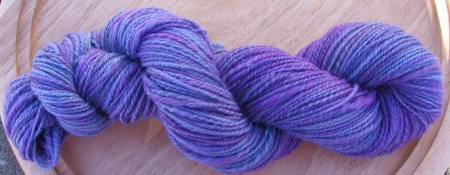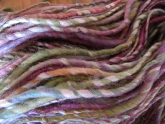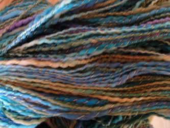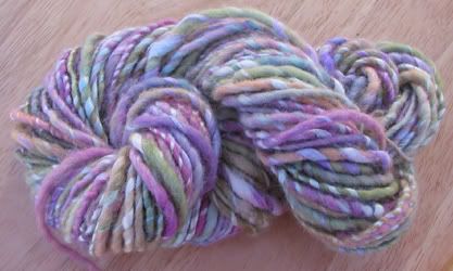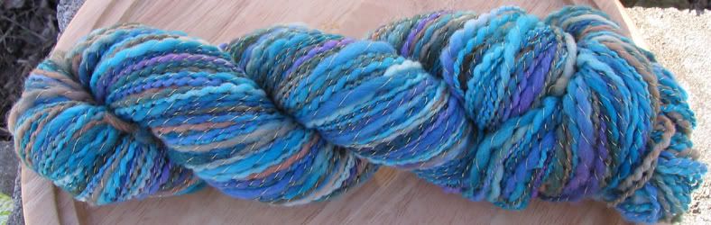 Dreamscape is the yarn I just finished. I carded together some Merino I had dyed greenish, blueish, reddish with some eggplant N.Z. Corriedale I had left over and some icicle blending fiber. Because it was really my first real project spinning from a hand-carded rollag, it's a very thick & thin yarn, but I love it all the same. SOLD!