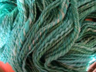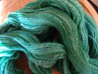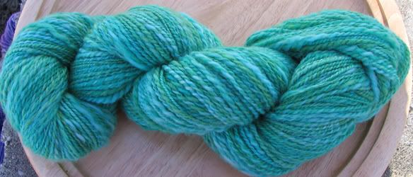 Waving, Not Drowning II is 189 yards of 2-ply BFL also. It was dyed with the same dye mixes, but in a different pot, so the colors are ever so slightly different. A bit more white and a bit less green than WNDI. From the wheel.